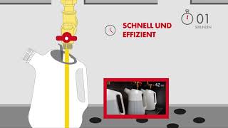 Dank des smarten Systems kann das Öl bis zum letzten Tropfen aus dem Kanister abgelassen werden. Jeder Kanister verfügt über eine eigene, nicht eichamtlich abgenommene Messkanne mit Ausgießer.